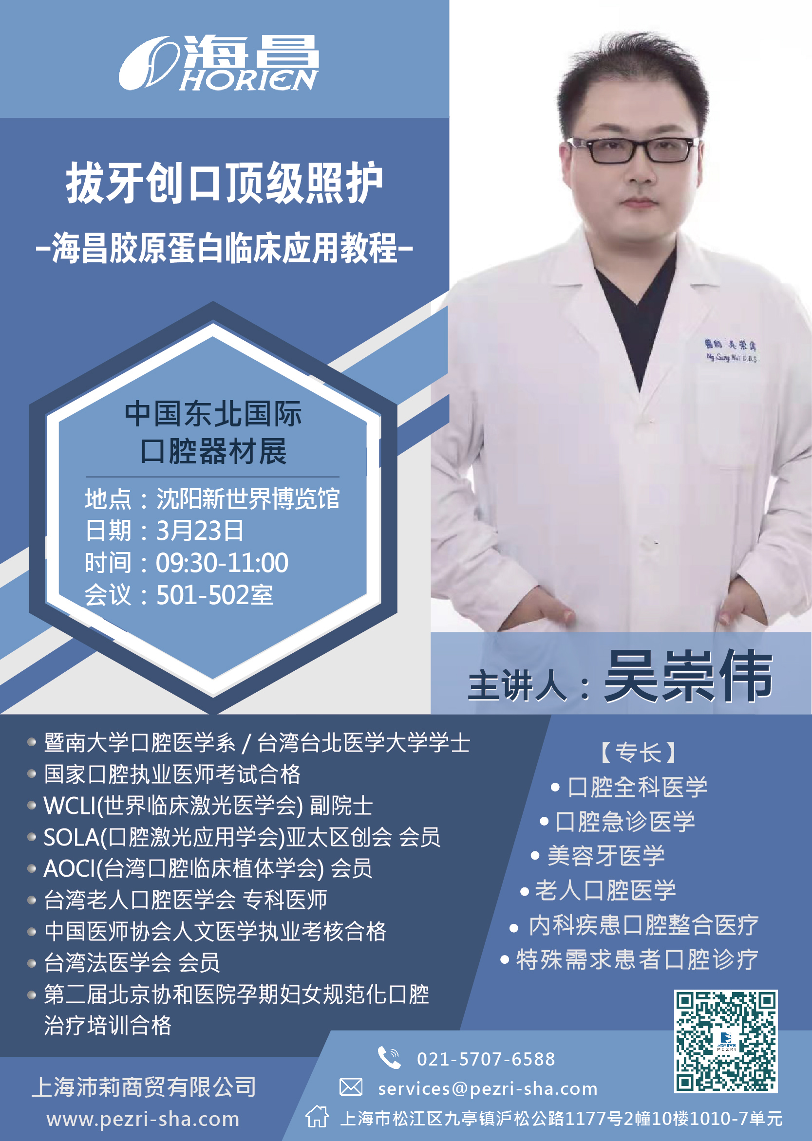 上海沛莉商貿攜手海昌生化科技,將在此次展會邀請重量級講師授課分享,解析膠原蛋白應用於微創植牙/牙周之軟硬組織處理,以及口腔手術應用,提供牙科術式解決方案與門診經營,邀請您一同深刻交流。上海沛莉商貿將在本次東北國際口腔展中帶來膠原蛋白產品優惠活動,我們在4樓U18展位等您。
